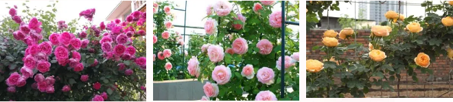 从左至右依次为:‘天方夜谭’、‘甜蜜马车’、‘ 闪电(埃克莱尔)’(图片来源于藤本月季网)