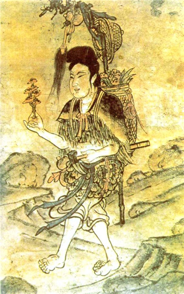 山西密县佛宫寺木塔内发现的辽代所绘神农像,其形象为右手举灵芝、左手持采药工具,背篓内药物满筐,其杖上悬有草帽、药壶等,行于山石间。画中神农氏采集到的药材就是灵芝。