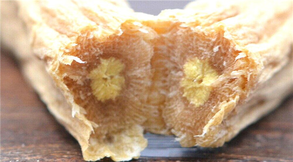 党参药材呈长圆柱形,稍弯曲。表面黄棕色至灰棕色,根头部有多数突起的茎痕及芽,每个茎痕的顶端呈凹下的圆点状;根头下有致密的环状横纹,向下渐稀疏;全体有纵皱纹及散在的横长皮孔,支根断落处常有黑褐色胶状物。质稍硬或略带韧性,断面稍平坦,有裂隙或放射状纹理,皮部淡黄白色至淡棕色,木部淡黄色。有特殊香气,味微甜。