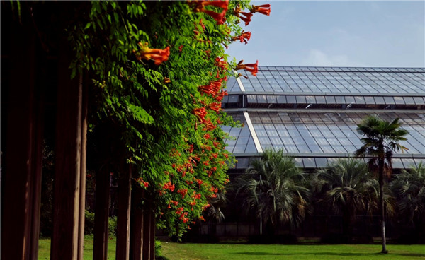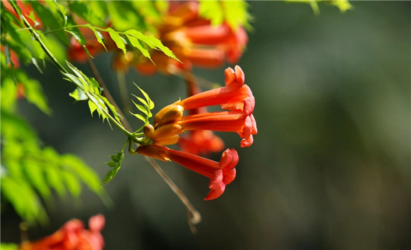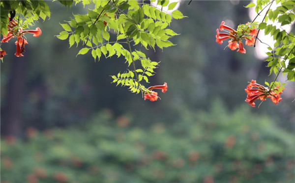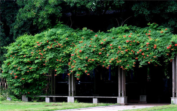 初夏时节,武汉植物园花径大道的藤廊上朵朵火红的花儿点缀着绿叶屹立于枝头,这便是凌霄花热情绽放的样子,十分美丽耀眼。