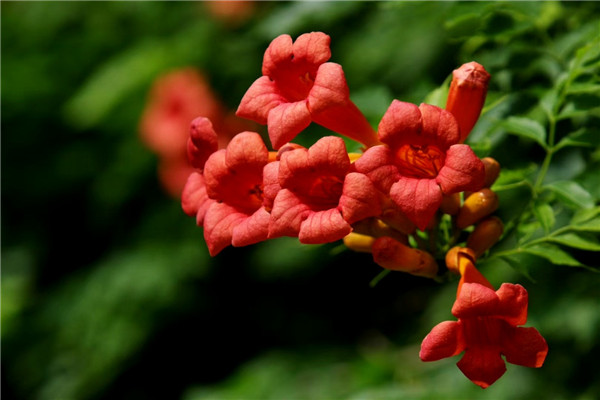 生性强健的凌霄,借助于自身的气生根,攀援于山石、墙面或树干之上,根沾土即活,茎沾土即长,虽默默无言却用自己的行动展现了一个决不妥协的攀援者风采,她顽强攀援、拼搏向上的精神正是人生爱拼才会赢的真实写照。