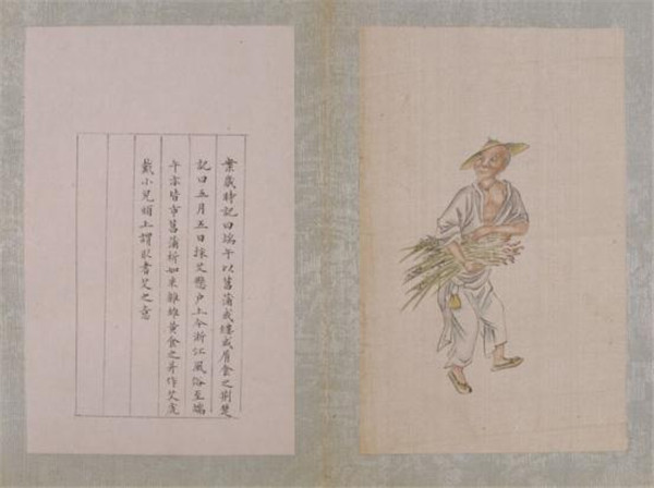 第三开名《採药草》,题:“五日午时蓄採众药治病,最效验。”这幅画中,采集药草,祛病防疫,是端午花草的首要主题。采集艾草,制成艾人、艾虎等,悬挂在门框上,是自古以来中国人的习俗。还有的用菖蒲叶(似长剑)、蒜头(似锤)等,都是驱邪去害、驱除蛇虫之意。