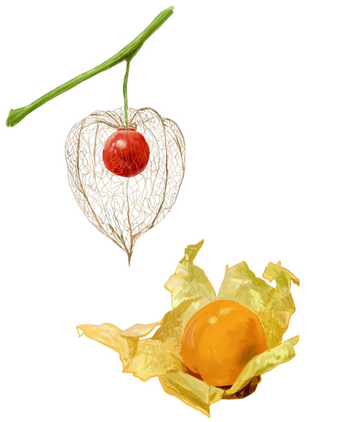 我国土生土长的是“红姑娘”,自然是有着红色的果子,口味却也与“黄姑娘”类似,它们是酸浆Physalis alkekengi L.及其变种挂金灯Physalis alkekengi var. franchetii (Masters) Makino的果实。