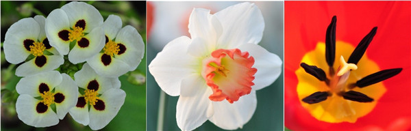 图3 同一朵花有不同的颜色搭配(左,爆米花慈姑 Sagittaria montevidensis 花基部具有紫色斑块;中,粉魅力洋水仙 Narcissus pseudo-narcissus 'Pink Charm' 副花冠橘红色;右,郁金香属 Tulipa sp. 雄蕊黑色)。