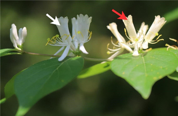 图5 金银忍冬(Lonicera maackii),初期花白色,随后逐渐变成黄色。白色箭头新花,红色箭头老花(下同)。