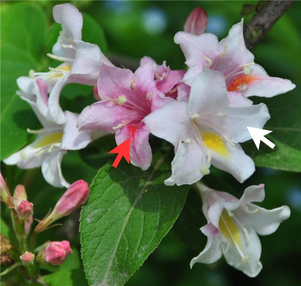 图6 锦带花 (Weigela florida)随着花期往后,花色逐渐变深。