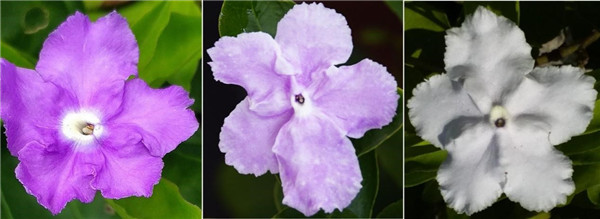 图7鸳鸯茉莉 (Brunfelsia brasiliensis)的花由蓝紫色渐变成白色。第1天初开为蓝紫色,2-4天逐渐变化为雪青色,第4-5天变为白色。