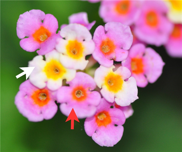 图8 马缨丹(Lantana camara),初开为黄色,第2天开始变为红色并逐渐加深颜色。