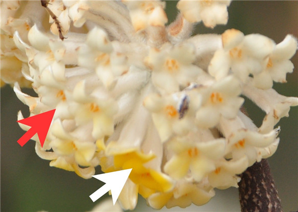图9 结香(Edgeworthia chrysantha),初开为黄色,后逐渐变为白色。