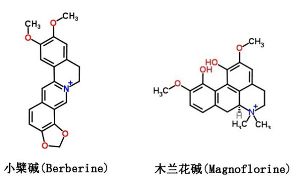 图12 小檗碱及木兰花碱结构,可使花朵显示为黄色。