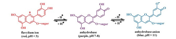 pH或者环境因素(如光照、温度和水分等)变化会通过刺激花内色素发生变化,进而改变花的颜色。比如,pH变化导致紫罗兰、牵牛花、月季、紫甘蓝等花内花青素变化而形成颜色变化,酸性环境偏红,中性环境偏紫,碱性环境偏蓝。