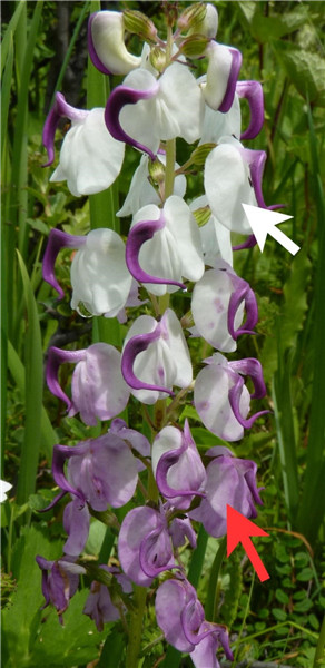 图14 尖果马先蒿 (Pedicularis oxycarpa),基部紫色花为老花,顶部白色花为新花。