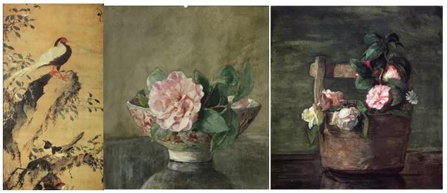 (图片来源于网络——林良 《山茶白羽图》、约翰·拉法基 《黑漆桌上中国碗里的山茶》、《日式裂纹陶器中的茶花》)