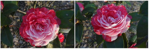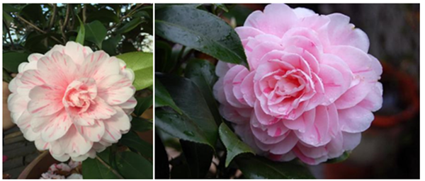 花色嫩粉,带红色细条,花瓣排列整齐,可以从11月份一直开花到翌年3月末。该品种是山茶花中的流行品种,它花朵硕大、花姿整齐、花色娇美,神奇的是它的树龄越长花色变化就越丰富,迄今发现已有纯红、纯粉红、纯白、红白相间的复色、半朵红半朵白的复色等丰富变化,堪称一绝,因此该品种被称作山茶界的“百变女王”, 在市场上非常受欢迎。