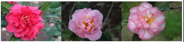 名品山茶‘赤丹’的突变品系,一株有多种花色,一是红花洒白色条纹,有的有粉边,也有半红半粉花朵,完全重瓣型,也就是说,没有花心,全部是花瓣整齐罗列而成。