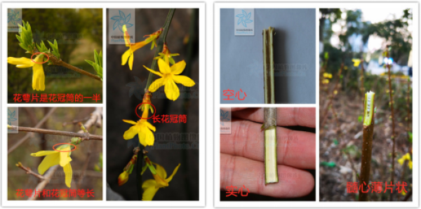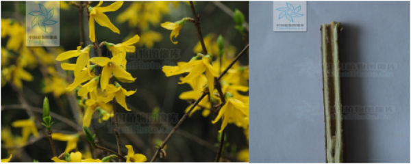 图1:连翘的花 图2:连翘的枝条切面(图片:中国植物图像库)