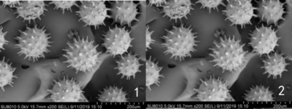 在肉眼可见的范围之外,很多靠昆虫传粉的植物花粉上也分布有毛刺,同样也是有利于附着在昆虫的身体或者体毛上,提高传粉效率。例如木槿的花粉粒就带有密密麻麻的刺。