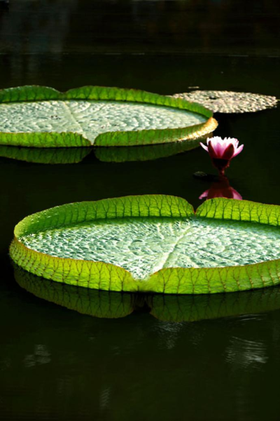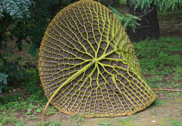 看起来王莲的叶子很薄,可它为什么能承受这么大的重量呢?原来王莲的叶子背面有着复杂而精妙的叶脉结构,一条条的粗壮主脉辐射开去,主脉上又有若干分支,于是形成纵横交错、十分牢固的网状骨架。除了强有力的骨架支撑,王莲叶子里面还有很多充满气体的气室,有这么大承重能力就不足为奇啦。