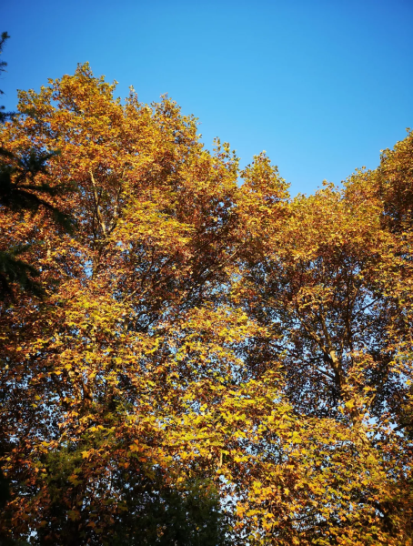 到了秋天,日照时间缩短、温度降低,在感受到低温后,树木开始准备落叶,但是叶绿素含有丰富的氮元素,为了回收这些元素,叶绿素会逐渐被分解,而叶片中原本就存在的类胡萝卜素比较稳定,不容易被分解。因此,当叶绿素逐渐减少,叶片中的类胡萝卜素相对含量就升高了,叶子也就呈现出了黄色、橙黄色等鲜艳的色彩。