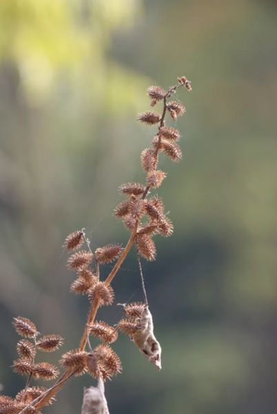 顺路而下,在本草园不小心被一颗浑身是刺的果实给黏住了,定睛一看,原来是苍耳子成熟了。苍耳(Xanthium strumarium L.)是菊科苍耳属的草本植物。苍耳的果实成熟后,颜色从绿色逐渐变成了棕黄色,密密麻麻的倒钩小刺又坚又硬。一颗颗果实正挂在干枯的枝头,它们要开启一场旅行的盛宴了,等人们和小动物路过时紧紧黏住,然后掉在哪里就在哪里发芽生长,开始新的生命轮回。来本草园走一走吧,说不定会带颗苍耳果实回家。