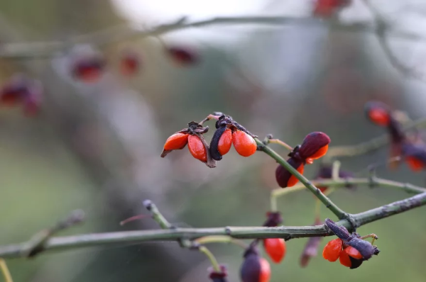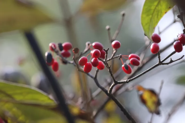 卫矛属的植物中,火焰卫矛(Euonymus alatus 'Compactus')的果实也是红色的。小小的果实成对长着,鲜艳夺目,特别漂亮。用手轻轻摸一摸,还有黏黏的感觉。