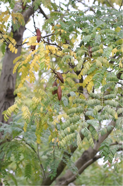 来到桃园深处,高大的肥皂荚也结满了果实,沉甸甸的。