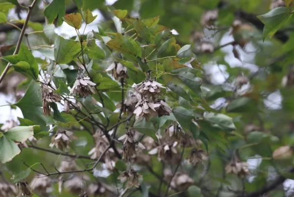 离木瓜树不远处,空中时不时飘落一颗小果实,那是三角槭正在寻找新家。三角槭(Acer buergerianum Miq.)是无患子科槭属的落叶乔木。果实像个小翅膀,成熟时,由绿色变成黄褐色,小坚果特别凸起。正是因为了这对小翅膀,三角槭的果实可以离开树妈妈,飞向远方,找到新的土壤生根发芽。