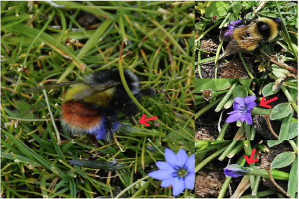 通过进一步对访花昆虫进行观测,发现有许多的昆虫都有访花的现象。在对西域龙胆(G. clarkei)的一次观测中,研究人员发现了一种熊蜂特殊的访花现象。
