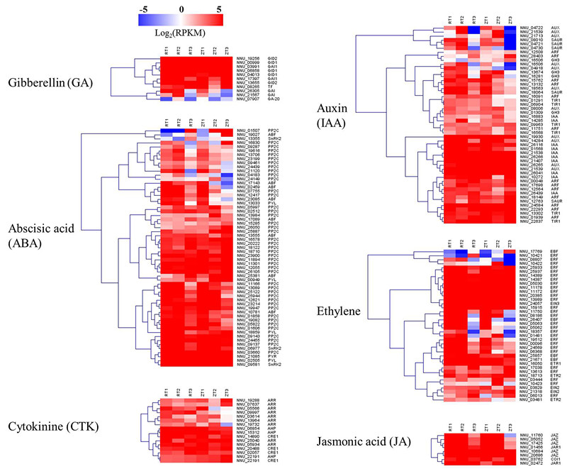 水生植物基因组学与遗传育种学科组杨美副研究员在杨平仿研究员的指导下,利用转录组测序技术深入分析了温带莲(ZO) 和热带莲(RL) 两个品种的地下茎在不同生长阶段的基因的表达。通过深入分析差异基因的表达情况,发现大量差异表达的基因属于碳水化合物代谢途径和植物激素信号传导途径。该研究结果为进一步揭示莲藕地下茎膨大机理奠定了坚实的基础,相关研究结果已在线发表于Scientific Reports 杂志。