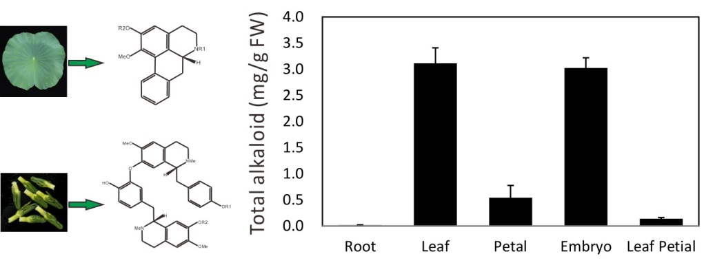 武汉植物园邓显豹副研究员在韩月彭研究员的指导下,利用高效液相色谱/质朴技术,首次就生物碱在莲植物体内的时空分布情况进行了全面研究。研究结果表明,莲生物碱主要在荷叶和莲心中累积,其含量高达其鲜重的0.6%。荷叶和莲心生物碱组分截然不同,其中荷叶主要累积阿朴啡类生物碱,而莲心则主要累积双苄基异喹啉类生物碱。荷叶在叶芽期生物碱含量最低,随着叶片的生长发育,生物碱含量稳步升高,至叶片完全展开呈墨绿色时到达顶峰,叶片衰老时生物碱含量稍有下降,但仍维持较高水平。同时,筛选了一批生物碱含量极高和极低的莲特异资源。研究结果也表明,生物碱作为一种重要的抗性物质,其生物合成除了受遗传背景、细胞种类、生长发育的调节外,外界的环境刺激(如机械损伤等)同样能影响生物碱的合成。