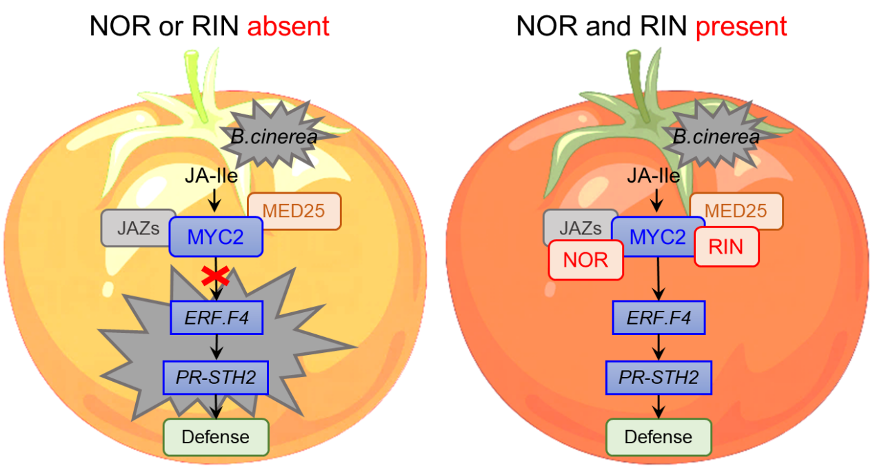 图1 番茄MYC2-NOR/RIN蛋白复合体抵御灰霉病作用模式图