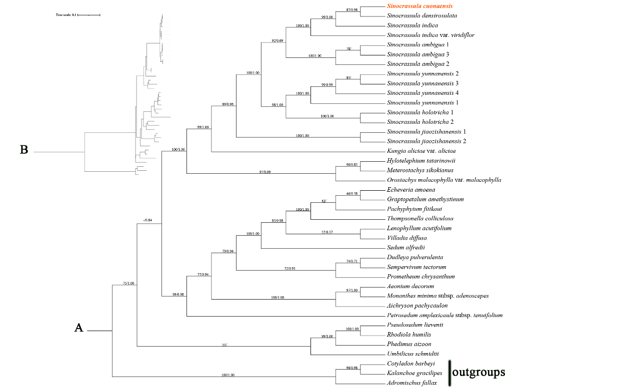 图3.基于ITS,rbcL,matK,psbA-trnH和trnL-trnF序列的石莲属系统发育树