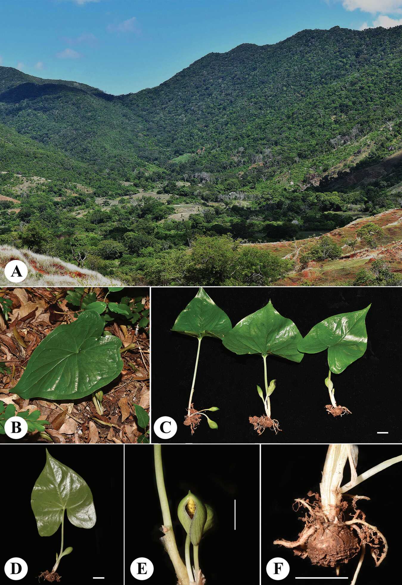 2025年1月,中国科学院武汉植物园植物多样性与进化研究组成员,与津巴扎扎动植物园(Parc Botanique et Zoologique de Tsimbazaza)和塔那那利佛大学(University of Antananarivo)组成联合科考队。在马达加斯加北部达莱纳(Daraina)地区进行野外本底调查期间,关注到一个林下地生的灰岩芋属居群,而该属植物通常被认为是典型的石生类型。经野外初步观察,该灰岩芋属植物叶为宽心形-箭形,与2012年在该地区发表的Carlephyton darainense相似,但其黄色的肉穗花序以及单雄蕊的雄花序,引起了研究人员的注意(图1)。考察队随即采集了足够的凭证标本、活体等研究材料。