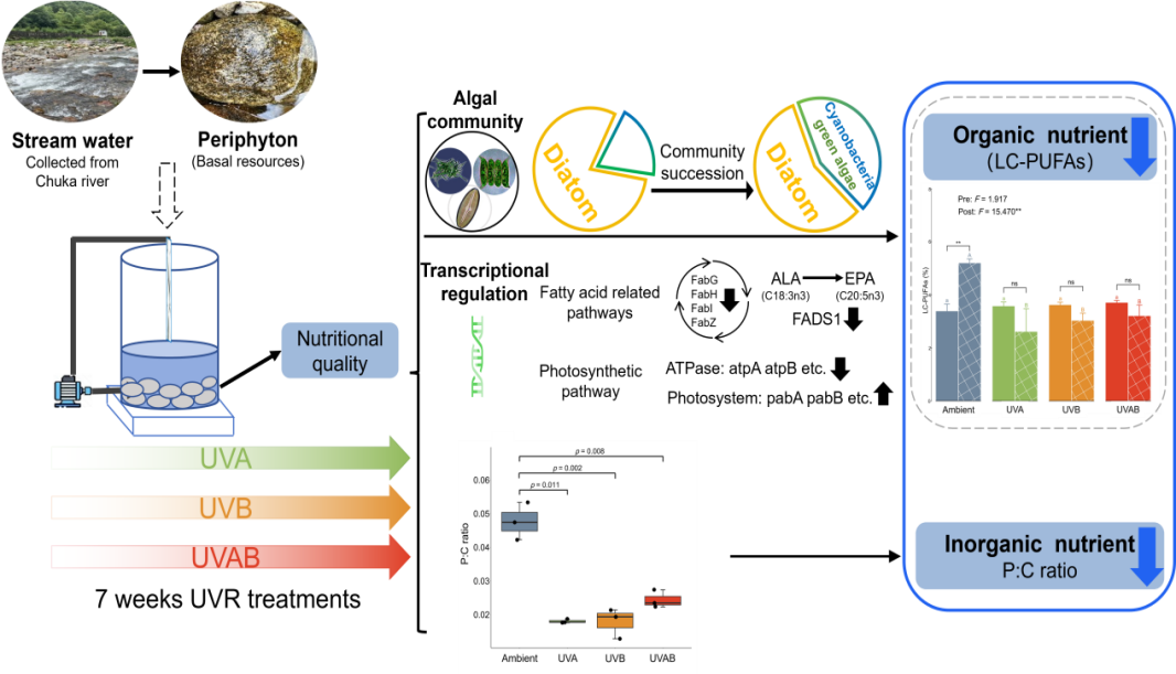 近年来,人们逐渐认识到水生食物网中基础资源的营养质量相较于数量对水生消费者的重要性。附石生物中的底栖藻类因富含多不饱和脂肪酸(Polyunsaturated fatty acids,PUFAs)被视为溪流食物网中高营养质量的基础资源。其中,作为有机营养物的长链多不饱和脂肪酸(Long chain-polyunsaturated fatty acids,LC-PUFAs),尤其是二十碳五烯酸(C20:5n3,EPA)是消费者生长、发育和繁殖所必需,而自身从头合成能力非常有限只能通过摄食获取;作为无机营养元素的磷,不仅参与细胞膜的合成,也直接影响藻类LC-PUFAs的含量,有机营养物和无机营养元素共同决定基础资源的营养质量。随着全球气候变化和平流层臭氧耗竭导致紫外辐射(UVR)增强,其对水生生态系统的影响日益受到关注。