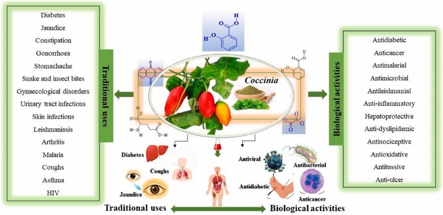 图1:红瓜属植物的传统用途调查、植物化学成分分析和生物活性研究结果的简要图解
