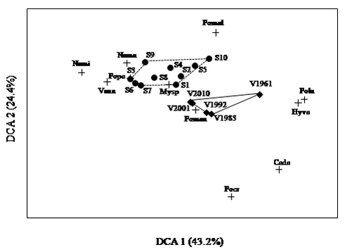 洪湖0-40cm10个层次的种子库组成与5个年份的植被数据的DCA排序图