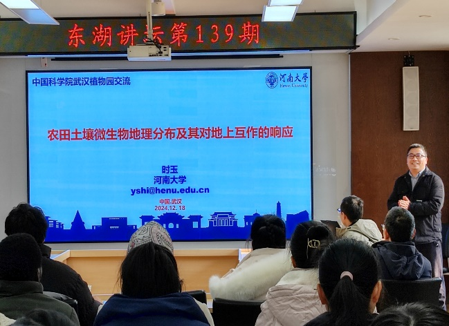 2024年12月18日上午,中国科学院武汉植物园环境基因学科组邀请了河南大学的时玉教授,做客东湖讲坛第139期,分享了题为《农田土壤微生物地理分布及其对地上互作的响应》的精彩报告。此次讲坛由杨玉义研究员主持,吸引了众多学科组的老师与学生积极参与。