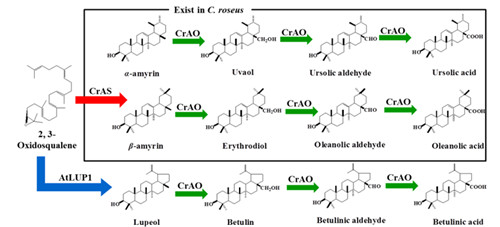 中国科学院植物种质创新与特色农业重点实验室天然产物合成生物学科组博士研究生黄莉莉在章焰生研究员的指导下,从药用植物长春花中首次分离了熊果酸与齐墩果酸合成途径中的两个关键基因(这两基因分别被命名为CrAS与CrAO),将这两个基因转入微生物酵母细胞,构建的转基因酵母系具备合成熊果酸与齐墩果酸的能力。更为重要的是,CrAO能够催化羽扇豆醇合成白桦酯酸,利用组合生物技术,将来源于模式植物拟南芥中的羽扇豆醇合酶(AtLUP1)基因与长春花中的CrAO基因进行组合并转入酵母细胞,形成的转基因酵母细胞系利用培养基即能合成抗癌化合物白桦酯酸。此举可以改善通过白桦树的树皮提取白桦酯酸而产生的生产成本较高且不利于可持续发展的问题。