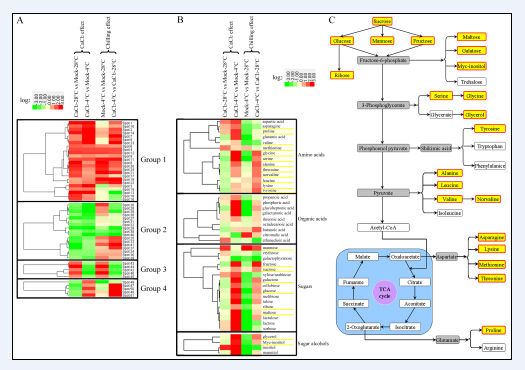 钙在正常和冷胁迫处理条件下调控的差异蛋白(A)和代谢物(B)的聚类分析及部分差异代谢物的代谢途径分析(C)