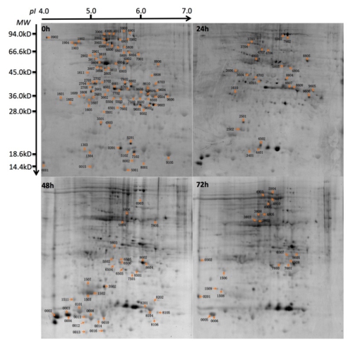 水稻种子萌发过程中胚组织蛋白质双向电泳Pro-Q染色图