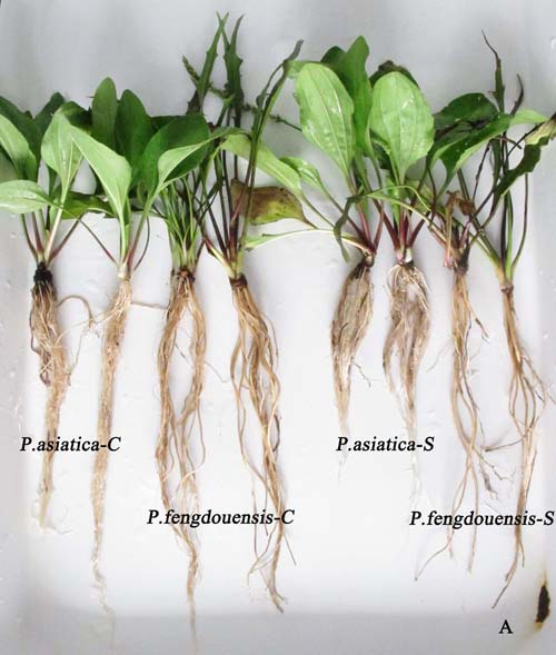 中国科学院植物种质创新与特色农业重点实验室植物水分胁迫生物学学科组杨帆博士在产祝龙研究员的指导下,以普通车前(P. asiatica)为对照种,在生理生化水平上比较研究了丰都车前的叶片和根对水淹胁迫的差异响应。研究结果表明,经过20天的水淹处理后,所有的水淹植株能完全成活,但两种车前的叶片和根对水淹胁迫的耐受性表现出明显的差异。水淹胁迫下,普通车前的根系生长受到明显抑制,而丰都车前的根系生长受到的抑制较小。组织化学分析表明:与普通车前相比,水淹胁迫条件下丰都车前的叶片中积累的更多的超氧阴离子(O2·?)和过氧化氢(H2O2),而丰都车前的根中积累的量更少。定量分析表明,丰都车前的叶片中H2O2、氢氧根离子(?OH)及丙二醛(MDA)含量在水淹胁迫后均显著增加,而在根中的含量并无显著性变化,而且叶片中的含量均显著高于根中的含量。相对应的是,普通车前的根中的?OH、O2·?、H2O2及MDA含量均显著高于叶片中的含量,而且水淹胁迫后叶片中的O2·?和MDA含量无显著变化,而根中的含量却显著增加。另一方面,丰都车前根中的还原性谷胱甘肽及脯氨酸含量、抗坏血酸过氧化物酶及谷胱甘肽还原酶活力在水淹胁迫下均显著上升,而普通车前根中的含量活力无显著性变化或显著性降低;相应的是,两种车前叶片中这些指标在水淹胁迫后的变化趋势较为一致。我们的研究结果表明相对于普通车前而言,丰都车前的叶片对水淹胁迫较为敏感,而根对水淹胁迫耐受性更好,并能形成一定的保护机制。丰都车前的根对水淹胁迫的适应机制可能与它的自然生境有关,在自然状态下,当夏季洪水来临时,丰都车前被淹,叶片腐烂死亡;当洪水退去,丰都车前再通过根系生长繁殖。该研究成果为三峡库区特有植物丰都车前的保护、回归自然及对维持三峡水库消落区的植物多样性提供科学指导。
