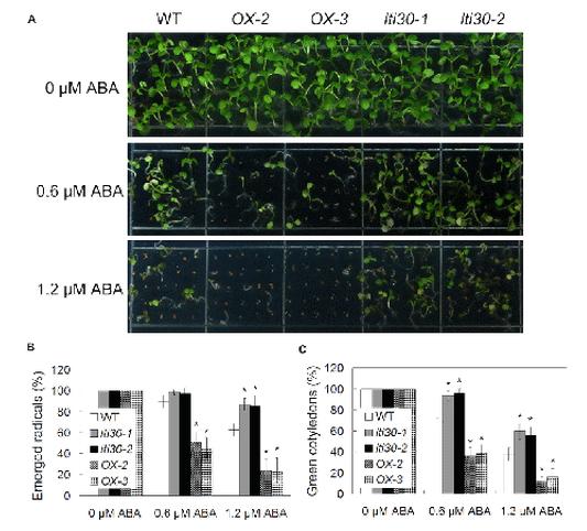 拟南芥LTI (Low Temperature-Induced)是一种脱水素蛋白,受到低温的诱导,是植物应答低温胁迫下游的重要作用因子。海南大学施海涛教授与中科院武汉植物园产祝龙研究员合作,研究发现LTI30作为一种正调控因子,增强植物的抗旱性。研究结果表明,LTI30受到ABA处理和干旱的诱导表达。LTI30过表达植株对ABA敏感,失水慢,具有较强的抗旱性。突变体植株则具有相反的表型。进一步的研究发现,LTI30影响到CAT的活性和活性氧的积累。过表达LTI30同时也增强了植物体内脯胺酸的含量。相关研究结果阐述了LTI30通过调控活性氧及脯胺酸,从而增强植物的抗旱性。论文发表在Frontiers in Plant Science上。施海涛与产祝龙是共同通讯作者。