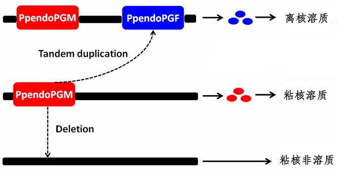 中国科学院植物种质创新与特色农业重点实验室韩月彭学科组揭示了两个串联排列基因PpendoPGF和PpendoPGM分别控制桃果肉溶质和离核性状,这两个基因都编码多聚半乳糖醛酸酶且两者同源性很高。桃祖先种可能只有PpendoPGM基因,果实表现为粘核溶质;之后PpendoPGM基因发生了缺失和复制两种突变事件,分别导致了粘核非溶质和离核溶质性状的出现。此外,PpendoPGF基因除控制果肉离粘核性状外,还具有引起果肉溶质的多效性,这导致“离核非溶质”性状无法形成。