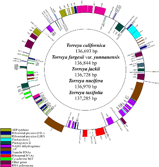 结果显示,所有榧树的叶绿体基因组编码117个基因,包括82个蛋白编码基因,31个tRNA基因,4个rRNA基因。和其他松柏类一样,榧树属叶绿体基因组缺失一个IR区,而其中,3个tRNA编码基因,trnI-CAU、 trnQ-UUG和 trnN-GUU复制为两个拷贝,推测是由于反向重复区的不完全丢失。整合所有已报告的红豆杉科叶绿体基因组,构建了该科的系统树。系统基因组分析很好的解决了榧树属内各物种亲缘关系,各支系得到了很高的支持率。在榧树属中,长叶榧 T. jackii 位于该属最基部,巴山榧T. fargesii 和日本榧T. nucifera姐妹关系得到支持,云南榧T. yunnanensis是他们两个的姐妹群。另外,红豆杉科内的各属之间关系得到了很好的解决,科内所有的属都是单系类群,榧树属和穗花杉属 (Amentotaxus) 的姐妹关系得到了100%支持。进一步推算了分化时间和生物地理事件,结果表明榧树属的分化主要发生在第三纪晚期,我们推测在中新世晚期 (~8.9-5.3 Ma) 的扩散抓住了白令路桥消失之前的“尾巴”,而之后的隔离形成了榧树属当今的洲际间断分布。结果还显示了在第四纪冰期循环期间 (~1Ma) 榧树属亚洲的种群发生过扩张。本研究不仅具有较大的学术意义,也为资源植物的认定和保护提供了理论基础。