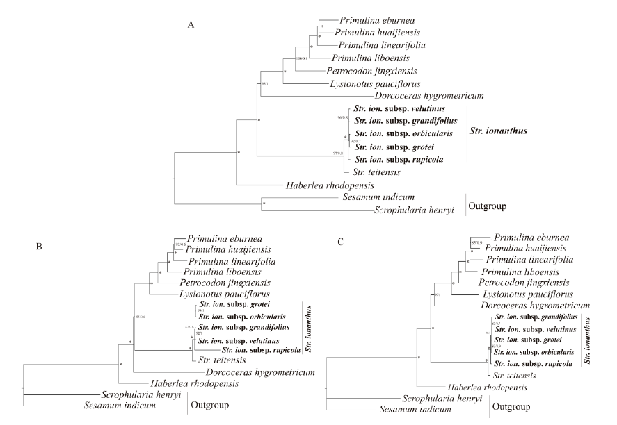 该研究从基因编码区和基因间区,筛选出了五个可变区(psbM,rps3,atpF-atpH,psbC-psbZ,psaA-ycf 3),和五个具有大量多态性位点的基因(rps16,rpoC2,rpoB,ycf 1, ndhA),为进一步应用在系统发育研究中提供数据。该研究基于全基因组序列,蛋白编码基因以及基因间区,利用最大似然法和贝叶斯推断重建了物种的系统发育树(图 3),在三个系统树中,基于有限的序列数据,五个亚种之间并未很好的分离,且分辨率仍不够高,这与之前的研究结果较为相似。但该研究报道的Str. ionanthus五个亚种叶绿体基因组数据,为今后阐明其系统发育关系提供了重要的序列资源,相关的进一步研究正在进行中。