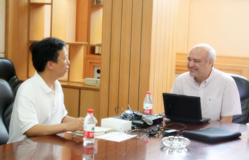 西班牙瓦伦西亚农业研究所首席研究员Leandro Peña(右)与韩月彭研究员友好交谈