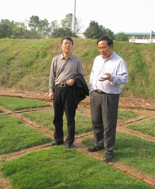 武汉市林业局副局长李景中(左)调研重点实验室草坪种质资源圃