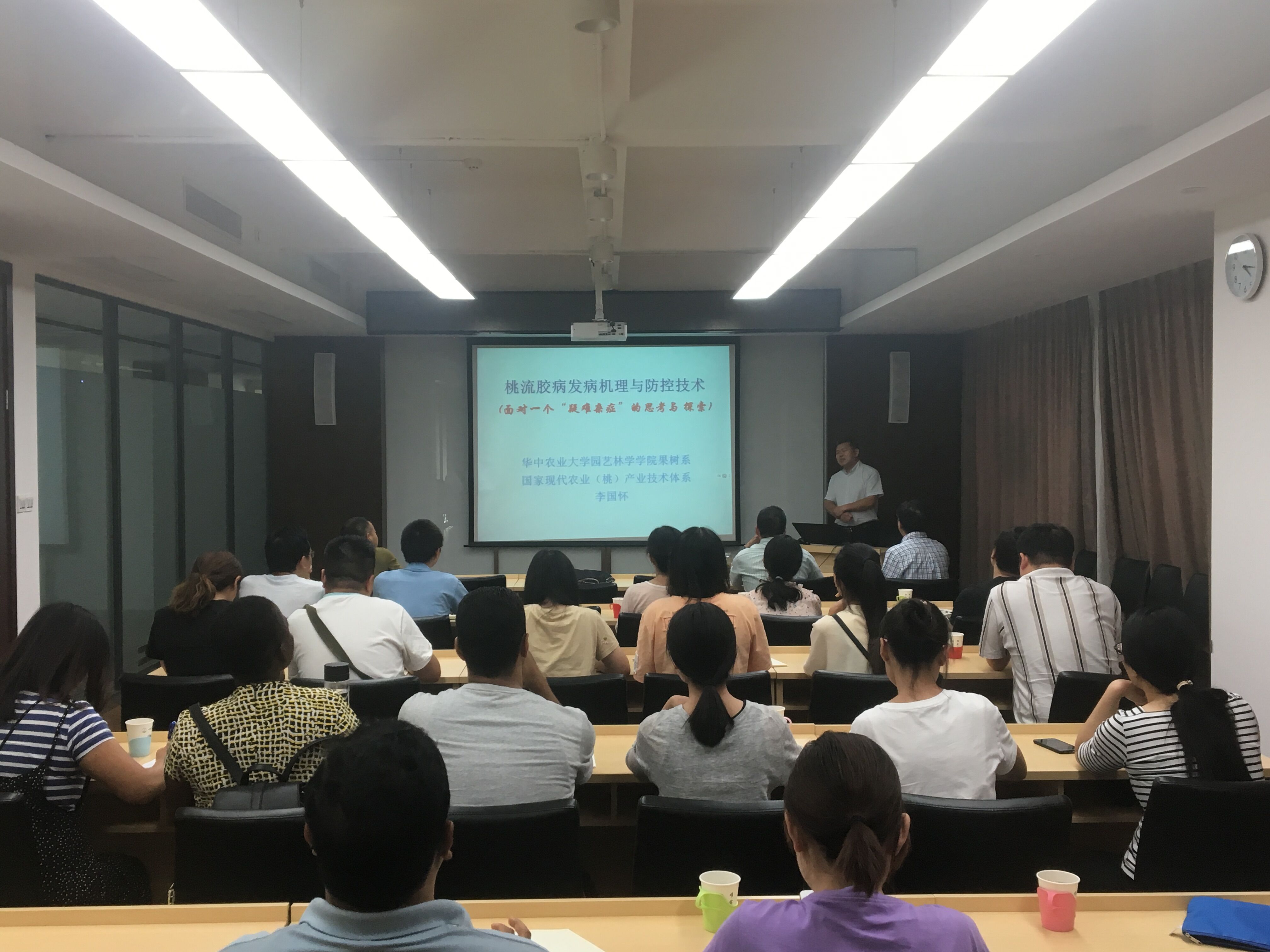 桃在我国各省区广泛栽培。然而,长期以来,我国长江以南的地区受温度、降雨等环境因素的影响而常发生严重的桃树流胶病,制约了桃产业的发展。针对桃树流胶病的发病机理与防控措施,李国怀教授为在场的师生们带来了题为“桃流胶病研究进展”学术报告,李教授详细地讲解了桃生理性与侵染性流胶病的不同发病机理,并重点就桃流胶病的防治措施给出了很多开创性的办法,为桃流胶病的防治提供了参考。