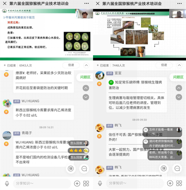 由于当前新冠肺炎疫情防控形势依然严峻,为避免人员聚集,本次培训会采用网络直播授课的形式进行,且不收取任何费用。广大猕猴桃从业者通过手机、电脑等方式足不出户即可实时收看猕猴桃专家的技术培训讲解,部分猕猴桃种植热情较高的种植户还自发组织集中观看学习,培训过程中,大家还可以在线实时与专家们进行提问和交流。据直播平台数据统计,本次培训会当天共吸引了2577人在线观看,当天累计在线人次达到6945次。本次培训会授课直播时长共7小时20分钟,结束后,登录直播间随时还可以进行回看,因此受益人数仍在不断增加。