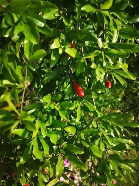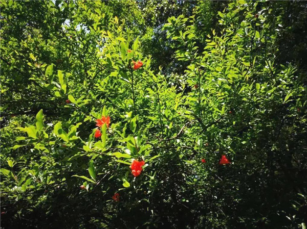 石榴枝繁叶茂、花色艳丽、花果期长,观赏价值极高。